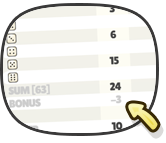 BonusNaast de punten van de bovenstaande combinaties zijn er 50 bonuspunten die eenmalig kunnen worden gewonnen door het bovenste deel van het spelformulier in te vullen en een totale waarde van 63 punten (5 dobbelstenen) of 84 punten (6 dobbelstenen) te bereiken. | ![]() |